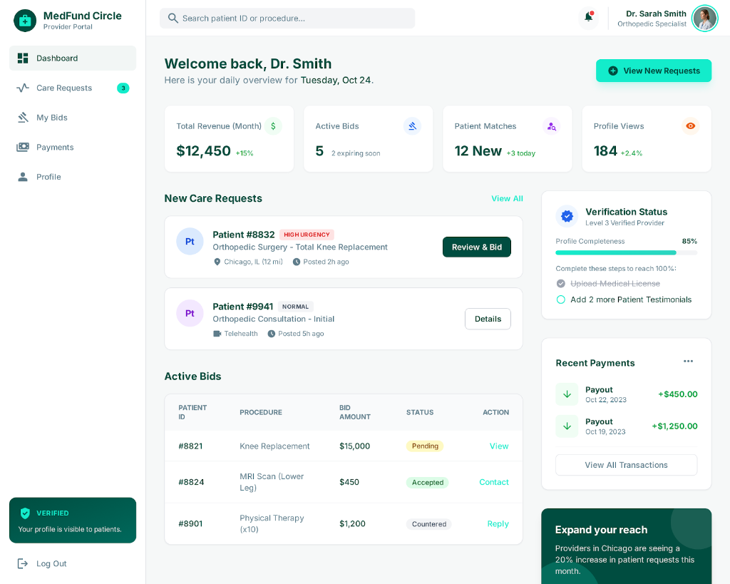 Funds are held in a Stripe-powered escrow. Once a patient accepts your bid, funds are locked and cannot be withdrawn. Payment is released automatically upon procedural confirmation.